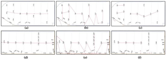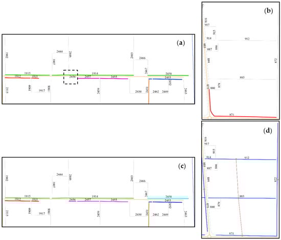 - Firstly, collinear relation will be recognized in Section 4.2. d6–d8 were considered as collinear ditches (red lines in Figure 5b) by the collinear relation detection rules discussed in Section 4.2. A new line (d16 in Figure 5c), from the starting point of the first line to end point of the last line in the collinear group arrangement, is used to represent one collinear group. Similarly, d17 represents the collinear group {d9, d10}.