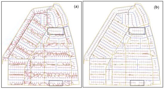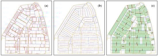 The ditches were grouped by a river and main road meshes after data preprocessing. A total of 111 ditch groups were achieved by ditch grouping. After that, the structure recognition was performed for each ditch group, and corresponding parameters were determined after constant debugging. The first structure was collinear relation. We set θ0 = 10°, α0 = 15°, β0 = 5°, l0 = 0.01, and λ0 = 100 m. Collinear ditches were identified and represented in red lines (Figure 8a). Thereafter, we set δ0 = 3.0 and μ0 = 0.7; all parallel relations were identified, which were connected by center points of parallel ditches (Figure 8b). Furtherly, parallel ditches with shorter average lengths were cut to eliminate the alternation between different parallel groups (Figure 8c). Finally, we set d0 = 50 m, A0 = 30°. Main-tributary relations were identified between parallel ditch groups and river segments, which were represented by an arrow from the parallel ditch region to their main river segment (Figure 8d).