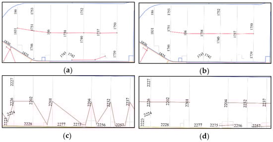 Detailed comparison of parallel ditches after extracting collinear relation: (a,c) Test 1 results and (b,d) Test 2 results.