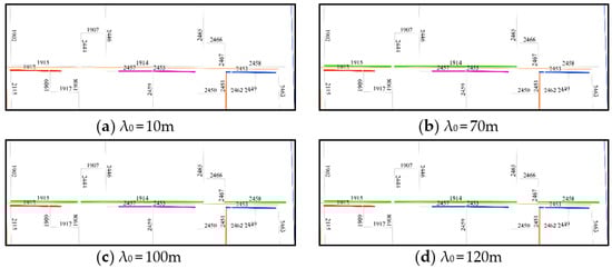 Various extracted collinear results by setting λ = 10 m, 70 m, 100 m, and 120 m; one collinear relation group was represented by the same color.