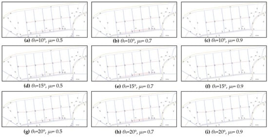 In parallel relation recognition, angle difference θ0 and directional projection ratio μ0 can have a serious impact on extracted results. We set θ0 = {10°, 15°, 20°} and μ0 = {0.5, 0.7, 0.9} to get nine different results (Figure 16). We contrasted the original parallel results to reflect the differences of parameter changes on parallel extraction clearly. The left ditch (id 295) was included in the parallel group by changing θ0 from 10° to 15°. After that, the extracted results did not change even though the angle difference was changed to 20°.