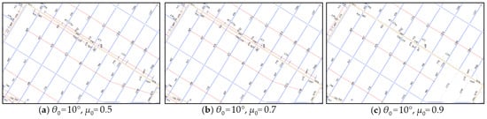 Parallel groups composed of short ditches changed when θ0 remained fixed and μ0 changed. Similar extracted results can be seen in Figure 17. The number of ditches in a parallel group reduced from 10 to 7 when μ0 changed from 0.5 to 0.9., More parallel groups would be eliminated with decreasing θ0 and increasing μ0. We recommend the range of θ0 from 10° to 20° and μ0 from 0.5 to 0.7.