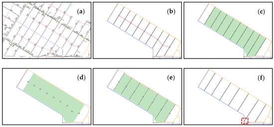 Generalization for the complex pattern of ditches: (a) the original data, (b) the result of merging collinear ditches after identifying a complex pattern, (c) canvas of parallel ditches (green area), (d) center points of parallel ditches, and (e) the output of the K-means algorithm. The dotted lines show the extension lines from center points to the boundary of the canvas in the average direction of parallel ditches. (f) The result after preserving the main-tributary relation between parallel ditches and river, which is shown in the red dotted box.