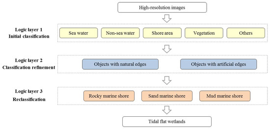 The proposed method originates from the perspective of logical layering. According to the definition of tidal flat wetlands, it belongs to natural wetlands, and there are three categories, including rocky marine shore (RMS), mud marine shore (MMS), and sand marine shore (SMS). On the first logical level, the approximate range of the tidal flat wetland was extracted, which is regarded as the initial classification. Then, the range was refined on the second logical level by predicting the natural shore edges. Finally, the target objects were reclassified on the third logical level to obtain the three wetland categories. The classification system and the logical structure are shown in Figure 1. The overall flowchart is shown in Figure 2, and the procedures are summarized as follows.