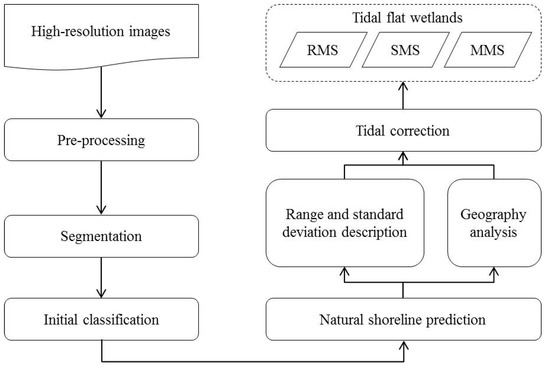 The aim of this study is to propose a method specifically for tidal flat wetland delineation and classification from high-resolution images and evaluate the method. First, remote sensing features and geographical buffers are used to establish a decision tree for initial classification. Next, a natural shoreline prediction algorithm is designed to refine the range of the tidal flat wetland. Then, a range and standard deviation descriptor is constructed to extract the rock marine shore, a category of tidal flat wetlands. A geographical analysis method is considered to distinguish the other two categories of tidal flat wetlands. Finally, a tidal correction strategy is used to regulate the borderline of tidal flat wetlands to conform to the actual situation. The performance of each step is evaluated, and the results of this method were compared with existing available methods to illustrate the effectiveness and practicability of the proposed method. As a first application, this method is demonstrated in Hengqin Island (an island in China facing directly to the South China Sea). A better understanding of the distribution of shores in Hengqin Island is critical to wetland protection and construction planning.