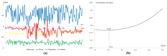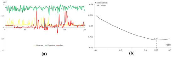 First, we sampled the categories to be classified, and then we calculated the NDWI of each sample. In this study, the sample number of each category is 200, and the NDWI value lines are shown in Figure 3a. represents the optimal threshold, which maximizes the distinction between water and nonwater. It can be observed that water and nonwater objects can be distinguished when ranges from 0 to 0.5. To obtain the specific value, we calculated the classification deviations (the total deviation of the misclassified samples in the target category and the nearest nontarget category) in this range, as shown in Figure 3b. The minimum deviation exists when the NDWI equals 0.11. Similarly, represents the optimal threshold, which maximizes the distinction between vegetation and nonvegetation objects, and the value of can be determined as 0.65, as shown in Figure 4. In addition, represents the merged water object with the largest area. The decision tree was established, as shown in Figure 5, and the classification was executed based on the rules. In order to improve the initial classification results, it was necessary to merge the connected objects and remove the small patches. Then, the rough scope of shore areas could be obtained.
