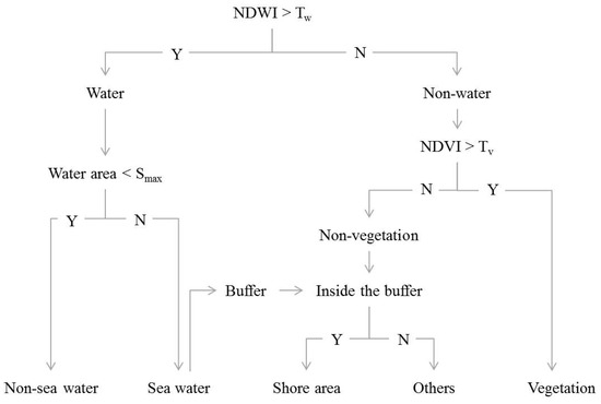The purpose of this step is to perform initial classification on the high-resolution images to extract the shore area roughly, i.e., accomplish Logic Layer 1 in Figure 1. There is both water and vegetation in the targets to be classified; therefore, it is important for the remote sensing features to be sensitive to water and vegetation. Normalized difference indexes are often used in the classification of remote sensing images because they are easy to compare, for which reason we chose the commonly used NDWI and NDVI to distinguish water and vegetation. Considering the adjacent distance between shore and sea, we divided the water into seawater and non-seawater according to the acreage of water targets, and the buffer zone of seawater targets was constructed to restrict the distribution of targets. The features explored in this study and their descriptions are shown in Table 1.