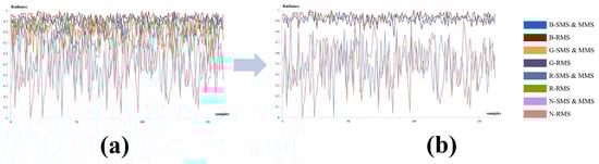 Band selection of high-resolution images. (a) The image consists of four bands (blue, green, red, and near infrared). The RMS has mixed spectral features with the other two types and quantities of redundant information that exist. (b) Little redundant information exists when there are only two bands left (blue and near infrared), which means less complexity and calculations of the algorithm.