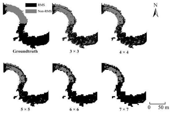 Observing the characteristics of the three shore wetlands, we found that the RMS has a more complex texture than the others, resulting in discrete gray values in a window with a certain scale. Hence, the range and standard deviation, which reflect the tightness and dispersion of the data, were selected to design a new feature description—the range and standard deviation (RSD) descriptor. Despite that high-resolution images with four bands contain plenty of information, the quantity of redundant information exists when they are employed to extract the RMS, as shown in Figure 7a. Therefore, two bands with less relevance were selected for feature description, as shown in Figure 7b. The specific steps of this method are described as follows.