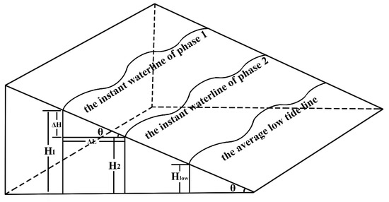 The principle of tidal correction is shown in Figure 9, and the implication of each character is explained below the figure. By computing the tidal height difference between different time and the average distance of the instantaneous waterlines of two phases, the angle of the tidal flat slope is calculated as