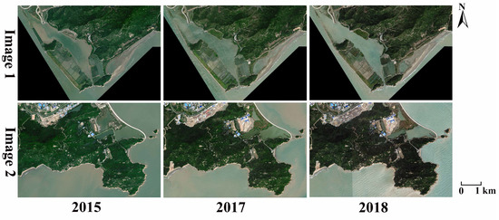 Six WorldView-2 images (Figure 10), located in Hengqin Island, Guangdong Province, China, respectively, acquired on 21 October 2015, 1 November 2017, and 15 January 2018, were utilized in this study. The Gram–Schmidt spectral sharpening method was used to fuse the multispectral bands and the panchromatic band, and then the cubic convolution method was used to resample the fusion images to an identical resolution. Detailed parameters of the used data are described in Table 3. Fusion images were finally used, containing red, green, blue, and near-infrared bands with a resolution of 0.5 m. The sizes of Image 1 and Image 2 are and pixels, respectively.