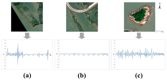 According to the NSP algorithm, slope change rate curves of different shore polygon edges were calculated, and the results are shown in Figure 11. There is a shoreline with both natural features and artificial features in the test area in Figure 11a. It can be seen from the slope change rate curve that the slope fluctuates at the beginning and then becomes steady from a certain point. According to the different fluctuant characteristics of the slope change rates, it is clear that the left part of the curve comes from the natural excerpt, and the right part comes from the artificial one. Figure 11b,c demonstrates the slope change rate curve of an artificial shoreline and a natural shoreline, which express the same fluctuations as in Figure 11a.