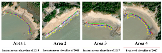 In this study, images from 2015 and 2018 were, respectively, selected as the first and second time to calculate the tide flat slope, and images from 2017 were selected for evaluation. According to the method in Section 2.4, the instant waterline prediction results of the four typical experimental areas are illustrated in Figure 13, and the corresponding accuracy indexes are shown in Table 5.