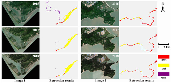 Hengqin Island, to which the study area belongs, is an island towards lands from the north, west, and east sides, but only the south side points directly towards the South China Sea. In Image 1, the SMS and MMS are distributed around an obvious lagoon and the south shore area with strong wave effects. According to the geographical causes and definitions above, we could scope the distribution range of the two shore wetlands. The SMS was distributed around the lagoon, and the MMS was distributed in the south shore area. As a result, the shore wetlands were distinguished, as shown in Figure 6a. In Image 2, natural shores are all distributed in the south areas towards the ocean, which means there are no appropriate circumstances for the MMS. Therefore, the natural shores in Image 2 were all classified into SMS instead of RMS, as shown in Figure 6b.