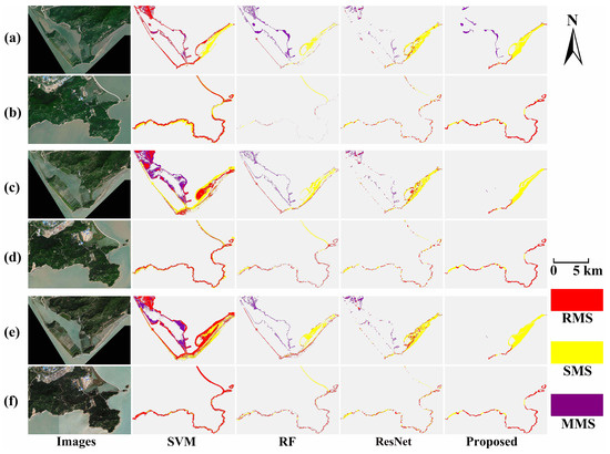 Figure 15a–f provides a visual comparison of the different methods, and the corresponding statistical results are listed in Table 6. For the SVM method, land and sea are separated in Image 1 from all three years, which mainly depends on the results of the initial classification in this study. There are still misclassifications when observing the details: the RMS and the SMS on the south coast are not distinguished, the RMS and the MMS around the lagoon are mixed, and the white waves in the sea are also misclassified into tidal flat wetlands due to their similar spectral features. The results of the SVM in Image 2 are a little more reliable than those in Image 1 when noticing the OA, which are caused by fewer tidal flat wetland categories, but it still shows a large number of misclassifications from the visual results. Moreover, the SVM method cannot distinguish between the artificial boundaries and the natural boundaries; for example, the artificial roads in the northeast corner of Image 2 are misclassified as natural targets. The extraction results of the RF method contain too much “salt-and-pepper noise" just as the SVM, despite the fact that it performs better than the SVM in accuracies, which are caused by their pixel-based classification modus. The ResNet34 model is conducted in an object-based way, just as the proposed one, which can solve the noise problems. Observing the visual results, we can clearly notice that the last two object-based methods perform well in achieving the purity of results. For ResNet34, there are also misclassifications between artificial boundaries and natural boundaries: the artificial roads in the northwest corner and the artificial coast on the west are mistaken for tidal flat wetlands in Image 1 from all three years. Additionally, ResNet34 performs poorly when distinguishing the RMS from the other two kinds. Large sample quantity reliance is the main limitation of deep learning methods, although there are only a small number of samples in this study that caused unsatisfying results when ResNet34 was unable to learn enough features of tidal flat wetlands. It can be concluded that the ResNet34 model has limitations when extracting tidal flat wetlands from high-resolution images when there are not enough samples. With the same samples, the proposed method performs well when solving misclassification problems, which can be seen from the results. The proposed NSP algorithm distinguishes the misclassifications of artificial objects from natural objects, and the RSD feature descriptor can easily extract the RMS when it has similar spectral characteristics with the surroundings. It can be seen from Table 6 that the OA of the proposed method are all above 88%, exceeding the three compared methods.
