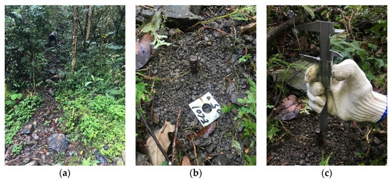 Illustration of field measurements in the Shihmen Reservoir watershed: (a) a natural slope, (b) an erosion pin and its label, and (c) measuring with a caliper ((c) from [22]).