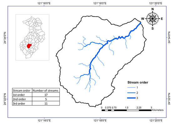 Stream order (U) indicates the complexity of a stream drainage system. The trunk river has the highest stream order and defines the order of a subwatershed [28]. An example of the stream order of a subwatershed is shown in Figure 3.