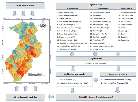 Figure 4 depicts the five research steps of this analysis. First, we created an input dataset of 36 independent factors by combining 26 morphometric and 10 environmental factors. Second, we divided the dataset into three folds of roughly the same size based on the main subwatershed attribute to balance the class distribution from the five main subwatersheds [40]. We also used the erosion pin measurement as the target variable. Each time one of the three folds was held as the test data for testing the model, the remaining two folds were used as the training data. The whole process was repeated three times. Third, we applied the random forest (RF) and gradient boosting machine (GBM) to create erosion models based on the training data. Fourth, we assessed the models with the test data. In the process, we eliminated the unessential factors and kept the best models. Finally, we created the spatial distribution maps of soil erosion depth of the study area using the machine learning models.