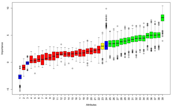 Boruta generates a corresponding “shadow” factor for each factor, whose values were obtained by shuffling the original factor’s values across objects. The system then classifies these using all of the extended system’s factors and calculates the importance of each factor [47]. Green is used to color the 15 factors listed as important in Figure 5. The 20 rejected factors are colored red, while the one tentative factor is colored yellow. To differentiate the variables, Figure 5 also shows the minimum, mean, and maximum of shadow factors. In general, factors ranked higher than the shadow maximum have been tested to be more significant than chance.