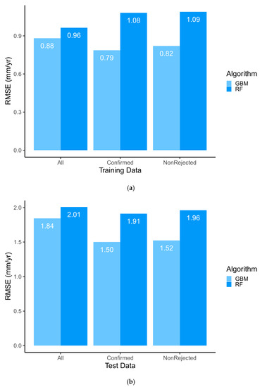 Overall, the best test result obtained in this study is 1.50 mm/yr (GBM) and 1.91 mm/yr (RF). Both of them are from the confirmed group. Compared to the previous study [22], which used a 70/30 split and only 14 environmental factors, the results are mixed. In terms of RF, the Nguyen et al. [22] result was 1.75 mm/yr, which is better than the current study (1.91 mm/yr). However, in terms of GBM, the present study (1.50 mm/yr) is better than the previous study (1.72 mm/yr). If we only consider the best model, which is GBM in this case, this study is better than the previous study.