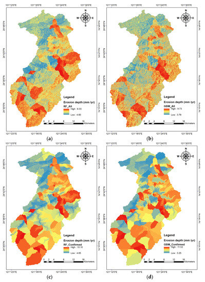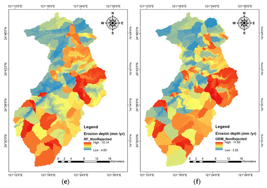 Using the RF and GBM models, we predicted the soil erosion depth of the entire study area, as shown in Figure 7. The data of the whole Shihmen Reservoir watershed were investigated and then entered into the R software after the preparation of the machine learning models for predicting the soil erosion depth. The results were transferred to the ArcGIS software to create the soil erosion depth maps. Figure 7 showed the spatial distribution of soil erosion depth (in mm/yr) over the Shihmen Reservoir watershed produced by each model’s three sets of factors: all, confirmed, and nonrejected. The red area represents a high erosion depth, whereas the blue area has a low erosion depth. Due to the morphometric factors used in the ML models, it is clear that the individual subwatershed has a significant impact on the soil erosion depth distribution.