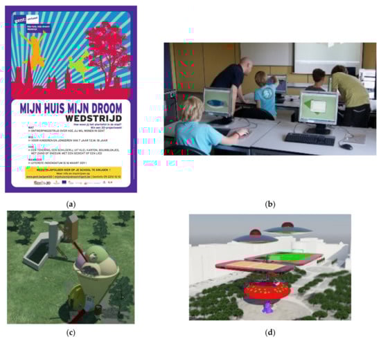 During the EFRD project in 2012, a children’s competition called “My house, my dream” was organised (Figure 1) []. About 100 children designed their dream house through different nondigital media. Ten selected children attended a 3D workshop week together with one MA student in architecture connected to each child. While children participated in the architecture sessions, living in the city and 3D modelling, the architectural students transformed each child’s dream house idea into a digital 3D model. After the workshop week, the 3D city model included ten newly designed virtual houses, to the parents’ and the mayor’s enthusiasm. The latter demonstrated that children’s involvement in thinking about the city’s future using 3D could inspire and engage them in the urban development participation []. The project’s success led to new ideas, showing architects an opportunity to put their projects in the 3D city model. As a result, Ghent decided to open 3D data online for architects and other actors (as the first Belgian city).