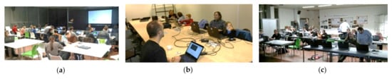 Three-dimensional City game Ghent, 2016–2021: (a) Instruction session; (b) Young and old together; (c) Co-creative workshop.