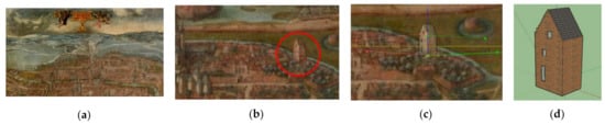 The lack of architectural drawings on the disappeared buildings is a problem for the digital reconstruction. Sometimes, the software might offer a helping hand, even for nonprofessionals, with a “matched photo” functionality to create 3D models starting from only one 2D-perspective photo. A click on “match new photo” on the “camera” allows one to import a building image. A base point must be placed and the lines positioned to coincide with the facade surfaces’ top and bottom lines. Immediately afterwards, this particular building could be drawn in 3D []. Given the rules for perspective and vanishing points, it is easy to generate two sides of a 3D building in more detail, but reconstructing the backside of a building, however, is guesswork that way. This technique was applied with Ghent oil painting of the 16th century (made by an unknown painter), reconstructing tiny houses (Figure 4). The next step in future 3D co-creation will include the use of parametric modelling so as to provide H-BIM libraries through the repetition of varying objects during specific periods []. More and more 3D models of architectural objects from past centuries (drawn by citizens and online 3D stores) will become available. A particular task is to catalogue all those building parts in digital 3D libraries and H-BIM environments. Changing the parameters instead of drawing in H-BIM will simplify the process.