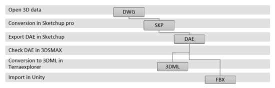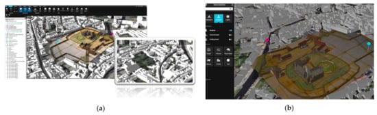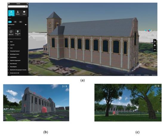 For a long time, 3D and 4D web viewers have been used for all kinds of applications and, more recently, for 3D city models, as well. The separate 3D models of city objects, e.g., street furniture or cultural heritage objects, could be found in all scales and on all themes online. Since the late 1980s, websites have existed with a growing number of 3D model collections, allowing designers to display and sell their 3D designs on the internet []. In 2010, the development of web-based VR applications in the field of cultural heritage was a direct result of the advance in surveying and internet-related technology []. In 2015, the number of online 3D models exceeded the four million (more than three million for free), with online 3D driven by global digital transformation trends in BIM, VR/AR, Industry 4.0 and robotisation []. By offering 3D models via Web3D technologies, virtual educational environments have become cheaper and more accessible []. With an object-oriented approach in historical research and visualisation, for example, it is helpful that 3D models are available online (for the archaeological documentation) [].