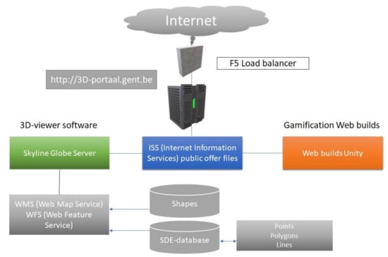 Different datasets are managed by the server (Figure 6). The static 3D data are using the SkylineGlobe Server (SGS) (in green). Three-dimensional Unity WebGL Builds (in orange) are found in another folder. On the SGS, the basic terrain with aerial photos is hosted as a terrain database, called MPT file, next to the other 3D data: 3DML files (made in TerraExplorer pro converting the DAE files), 3D shp, 3D tiles and 3D scan data. Two-dimensional data files might be added by means of the WMS and WFS services. While the SGS manages the static 3D and 4D information, the animated scenes are available in the Unity WebGL Builds. These output data consist of one folder per project with an index file and two other folders (build and template data) automatically generated by Unity. Both are managed by the “Internet Information Services” (ISS) (in blue). Finally, a load balancer acts as a portal to the internet. This server enables the Animated Spatial Time Machine (AniSTMa), using two combined software environments, the 3D geoviewer software (with spatial analysing possibilities) and the online use of a game engine (with animation). The hyperlinks connect the WebGL builds’ URLs to the 3D web service from Skylinesoft. At the beginning of 2021, the data formats GeoJSON and 3D Tiles were tested, because the cross-domain (and data transfer) problems should be solved in a more integrated way [].