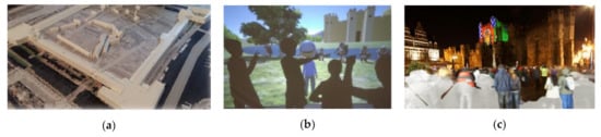 One of the necessary actors in game development or gamification is a storyteller. After translating the story into a 3D game engine (for fun or education), people’s engagement will increase if they recognise the story in other media. A fundamental aspect of creating the interactivity dynamics and history personalisation includes the focus on the narrative and collaboration []. Using TS, the co-creative workshops did not end in the digital environment but in a hybrid output. The 3D reconstructions were 3D printed (Figure 7a), and information sessions about the production took place. Walks were organised in the surroundings of the demolished castle, and the local television commented. The description of 3D modelling is part of a book on the castle []. The transmedia view shows that someone has more empathy when identifying him/herself with the avatar, augmenting the story’s effectiveness in this way []. Workshops were organised for children during which they redesigned old city castles, integrating medieval characters and playing with the shadows in the projection (Figure 7b). One of the 3D workshops’ precursors was the co-creative design of new virtual walls for the Castle of the Counts during the light festival in 2012 (Figure 7c), executed after a citizen contest. It was a cheap action to promote cultural heritage creatively. TS is not always possible, because it is a question of funds []. However, it has become cheaper in co-creation. An extra motivation is that the knowledge of the city history is as necessary as the sensor data of the Smart Cities’ actual situation.