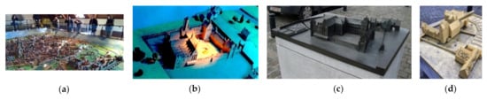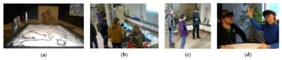 The awareness grew that this 3D co-creative project could aid the interactive education. Transmedia supports new pedagogics, and interdisciplinary collaboration might solve complex educational problems []. TS should include people with visual or hearing impairments, so if transmedia production spans multiple media platforms, it is particularly suitable for these people in a shared storytelling world []. Figure 8 shows different 3D tools during the 3D co-creative project. Three-dimensional workshops and VR demos in the old Spanish castle’s ruin (Figure 8b,c) and AR tests on the 3D co-creation models were performed (Figure 8d). An inventive look at the opportunities to combine the past and present delivered several excellent transmedia projects. In 2010, the renewed City Museum (STAM) presented a big 1/1000 scaled aerial photo of the city on a walkable floor. Above the city centre, a 3D printed model of the city centre 1/1000 was available (4.2 m × 3.4 m), presumably the largest printed 3D city model in Belgium in 2010 (Figure 8a). In 2020, the giant white 3D print changed from a “visual” to a tactile function, utilised for workshops with children. The co-creative 3D modellers applied this to fit their 3D printed historical reconstructions as an exercise to rebuild the old city (as a kind of TS). A 3D printed touchable maquette augments the tactile interaction, so blind people could participate in the Animated Spatial Time Machine (AniSTMa).