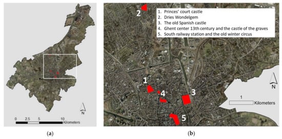 - Van Wittenberghe, D.B.; D’hondt, B. A historical walk in 3D (Een historische wandeling in 3D). In Het Spaans Kasteel Gent, van Dwangburcht tot Woonwijk; Fabien Audooren & Christine De Zutter: Gent, Belgium, 2018; pp. 226–239. ISBN 978-90-814-1463-o. [Google Scholar]
