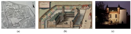 The Princes’ Court Castle in Ghent (Belgium) is the birthplace of Charles V (emperor of the Holy Roman Empire, Charles I, king of Spain, 1500–1558), whose personal union of the European and American territories labelled the first collection of realms “the empire on which the sun never sets” []. This castle was surrounded by water in the city centre during the 16th century (Figure 10a,b). In the 17th century, however, the castle’s decline began, and most parts of the castle became demolished during the 18th century. In the Princes’ Court Castle neighbourhood, the remnants are still visible on several walls of the existing buildings, and only the “dark gate” has remained so far (Figure 10c).