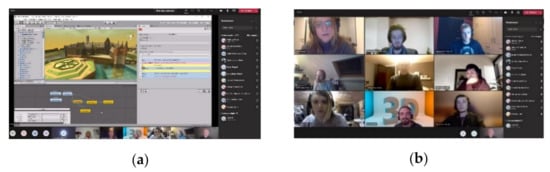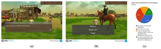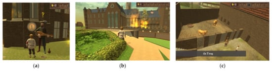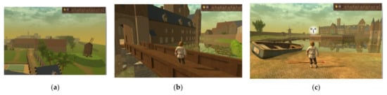 Producing a digital 3D game or gamification requires at least three profiles: 3D modellers, programmers and storytellers. Citizens took up these roles. Sketchup designs made by 3D citizens were imported into the 3D game engine Unity, but Blender and Cinema4D files were also added [,]. They started using assets from the Sketchup 3D warehouse and the Unity Asset Store to remodel the buildings’ surroundings (trees, vegetation, street furniture, animals) []. The internship students helped the co-creative participants to animate the 3D models in movement poses in Z-brush, Blender and 3D Studio Max. The co-creative participants with minimal experience but an excellent drive for programming started to add code for animation. Implementing different gameplay activities triggered engagement: actions, search, puzzle and craft. The audio also received attention, because it is another higher dimension of a multidimensional game environment.