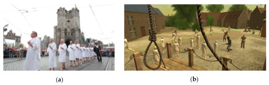 The evocation of life in the 16th century castle was completed with various animated scenes. By means of the Unity shaders, a part of the castle burned again (Figure 14b), and 3D lions were revived in the “Lions court”, as they lived there during the 16th century (Figure 14c). In order to show the opportunity to reuse the former 3D scenes in the game, a small snake game about “the noose barriers” (in Dutch: “Stroppendragers”), created earlier, was integrated. In the 16th century, dozens of Ghent dignitaries were forced onto their knees by King Charles, dressed in white tabards with nooses around their neck (Figure 15) [].