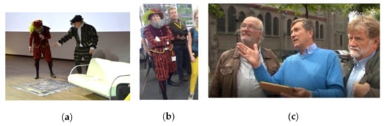 The Transmedia Storytelling (TS) in this project builds on Ghent’s three-year “3D city game Ghent” adventure. This co-creative project has been promoted during several events and was broadcast on local television. During Flanders’ most significant “ICT for government” event (“Meeting Day Information Flanders” with 3000 participants) at the International Congress Centre Ghent, the 3D Team of Ghent city organised a whole track regarding “The parallel virtual universe in Ghent” on 26 November 2019. The co-creative participants played a performance; someone in King Charles’s outfit met someone else as Gerard Mercator (born in the Ghent surroundings in 1512, inventor of the world’s first atlas) and performed a historical dialogue on scene (Figure 18a,b). A co-creative citizen also established a website on the digital castle and promoted guided walks (Figure 18c) with a large rolled-up aerial photo with 3D printed buildings of his work [].