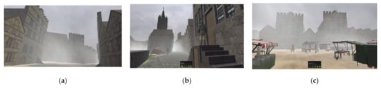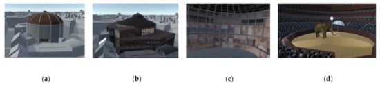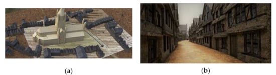 Game engines allow recreation of historical scenes in a time machine with animated virtual 3D characters []. With historical clothing, facial expressions, gestures and postures, historical characters can visually convey a multitude of information in a vivid, engaging way []. The resuscitation of the past social life is possible through 3D animated character modelling and historical scenes’ reconstruction []. Three-dimensional co-creative gamification is an appreciated tool for dynamic animated evocations. Game engines are a step forwards in using VR/AR/XR. More and more applications with VR on 3D city models are described [,]. Even AR is applied for 3D city models, but mostly without moving objects []. Regarding the animated models, game engines are primarily used [].