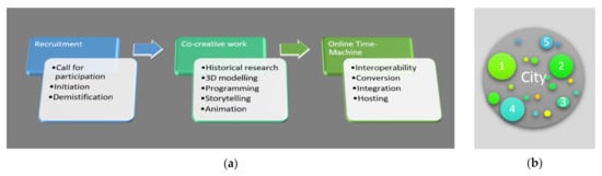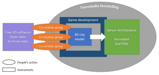 In 2016, the City of Ghent (Belgium) started a project to involve citizens in the digital 3D reconstruction of their environment’s past (in co-creation, without funds). Ghent is a pioneer in 3D city modelling. It started with 3D modelling for urban design, planning and city renewal during the 1980s. In the 1990s, they performed experiments with Virtual Reality (VR) and, a few years later, with 3D GIS and digital drawing participation processes. Ghent received different national awards for combining co-creation and innovation in 3D city modelling. In a co-creative project promoting “Dream with us in 3D!”, dozens of citizens joined workshops to learn 3D drawing or writing code; some of them were interested in reconstructing the city’s lost historical architecture. After co-creative 3D modelling and gamification, the results became accessible in a 4D web environment. The 4D web environment became part of Transmedia Storytelling (TS): an integral process of combining various media in which each medium makes its unique contribution to the unfolding story, creating a unified and coordinated entertainment experience []. For this co-creation, all kinds of media were used. Combining real and virtual objects was already explored by Milgram as Mixed Reality (MR) in the virtual continuum of 1994 [].