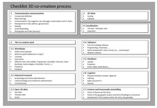 Co-creation is theoretically creation through interaction. However, Ramaswamy et al. formulate this as follows: “Co-creation is an enactment of interactional creation across interactive system environments (afforded by interactive platforms), entailing agency engagements and structuring organisations” []. Focusing on 3D co-creation, free drawing programs such as Sketchup were already proposed as useful for the nonspecialist in 2010 []. In 2017, citizen design science (a combination of citizen science and citizen design) was proposed by Mueller et al. as a strategy for co-creative urban design focusing on their neighbourhood []. In cultural heritage, co-creation provides value through multitechnology such as VR/AR and 3D printing [,]. Archaeology could show the core of co-creation by letting go of control and by being guided by the masses in the digital preservation of archaeological objects []. In “The art of Crowd dreaming”, a methodology has been proven to digitise cultural heritage as cross-generational digital monuments in a co-creative living lab []. Finally, Building Information Modelling (BIM) is a co-creative process for professionals. It enables collaboration between various construction partners. After finishing the building, BIM remains in use in facility management during the lifetime of a building. The benefits of co-creation in the design process are essential here [].