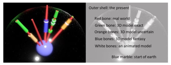A fascinating science project is Rome Reborn []. Since 1997, community members make apps and videos of the ancient city as it appeared in 320 CE. In addition, a 3D scan of the old maquette “Plastico di Roma Antica” (16 × 17.4 m) has been added []. The 3D scanning of old physical models, as described by Kersten et al., is also a means of integrating the past in a 4D city model []. The development of a 4D mirror world is the objective of the Time Machine project, which the European Commission has selected as one of the six most critical large-scale research initiatives for Europe’s future in 2019 [].