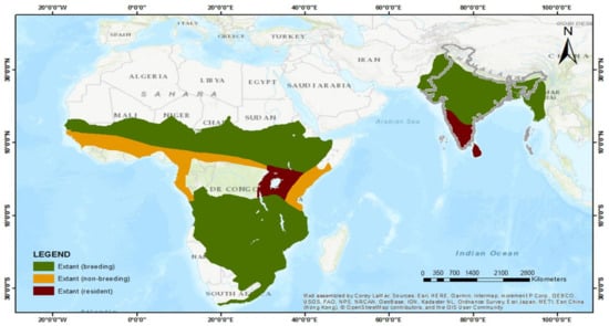 Extant map of Clamator jacobinus (Pied cuckoo) (Image Source: reference [30]).