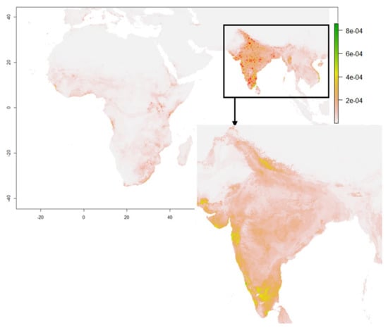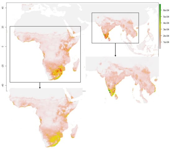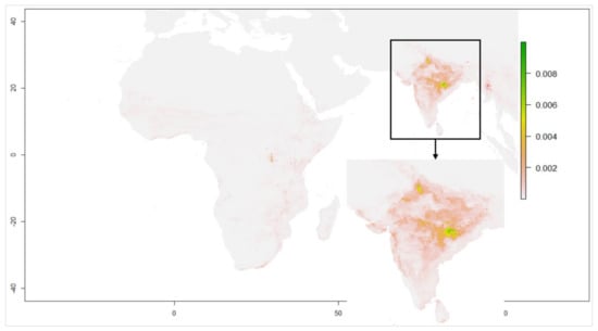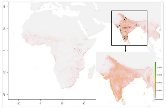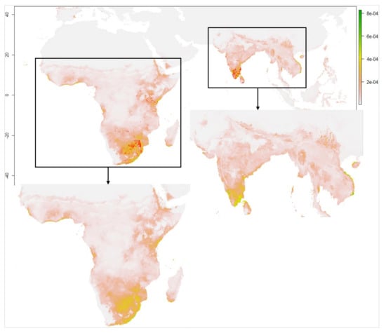 The correlation test between the environment variables for each of the three seasonal sets was carried out to retain the ecologically relevant variables in the species’ suitability. Spearman’s correlation coefficients [104] were applied on the variables set, where, if the variables had a Spearman correlation < 0.7, those variables were not highly correlated. Then, the Variance Inflation Factor (VIF) was calculated in R software for each remaining variable using the vifcor function of R package usdm [105] and eliminated the environmental variables whose VIF values > 3, because the smaller VIF values hold low correlations. The resulting VIF values were <3 [106], and therefore, no further variables were eliminated. This correlation test among the environmental variables was performed for India and Africa separately, and these screened environmental variables were then used in the Maxent model to predict the habitat suitability in the abovementioned study areas.
