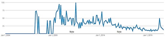 The change in climate, particularly the Indian southwest monsoon patterns, were analysed with respect to the Jacobin cuckoo in the past 30 years by separating the datasets into two subsets—1991–2005 and 2006–2020. For this, the climatic variables were used for these yearly subsets, and their results are illustrated in Figure 4 and Figure 5, respectively. In Figure 4, there is no suitability predicted in Africa in 1991–2006 during June–September because of its dry weather, which is unsuitable for the bird, but, in India, an adequate habitat suitability can be seen in the eastern parts and northern parts but not the southern and western parts, due to the bird’s migration to India in search of a wet climate. When the suitability results of Figure 4 are compared with Figure 5, a decline is observed in the Indian monsoon rainfall in the north and east for the past 15 years in June–September. Additionally, this study on climate change was completely dependent on sightings of the Jacobin cuckoo, so one of the reasons of less suitability in Southern and Western India would be less sightings of the bird due to the unawareness of crowdsourcing. As per Google Trends search records from 2004 to the present (Figure 6), the public interest in the term “crowdsourcing” in India started in 2007.