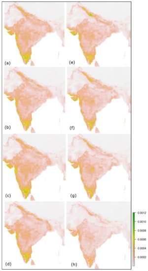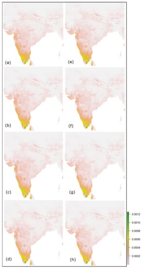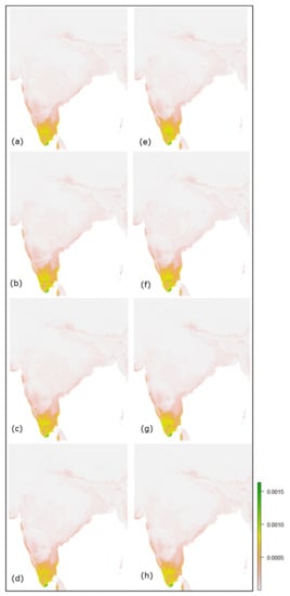 Predicted future habitat suitability maps of the Jacobin cuckoo during June–September of India for the 2030 SSPs 2.6, 4.5, 7.0 and 8.5 (a–d) and 2050 SSPs 2.6, 4.5, 7.0 and 8.5 (e–h).