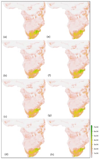 Predicted future suitability maps for Jacobin cuckoos from October to December in Africa: (a–d) and (e–h) represent the SSPs 2.6, 4.5, 7.0 and 8.5 for 2030 and 2050, respectively.