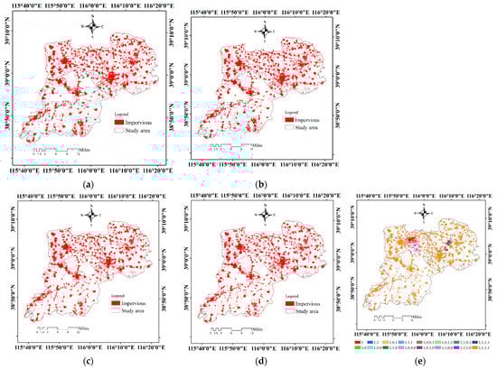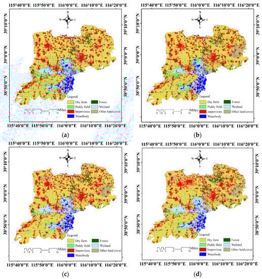3.4. Comparisons among the Derived LULC Maps and Other Land-Cover Maps of Xiong’an New Area