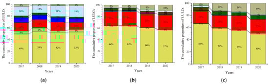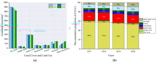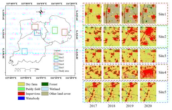 3.2. The Spatiotemporal Changes and Patterns of LULC in Xiong’an New Area from 2017 to 2020
