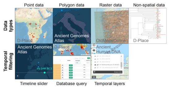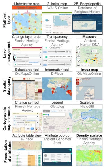 9]). Platforms based on open-source technology with minimum implementation costs and allowing international, collaborative use, are at the center of community-driven spatial data sharing. This is also obvious when examining the diverse supply of existing spatial data platforms on human-history themes (in this study, meaning a variety of data related to biological and cultural evolution, including genetic information, language areas, archaeological findings, ancient settlements, old maps, (paleo)environmental data, and old placenames). However, our analyses reveal that most of the existing historical spatial data platforms are still restricted to one theme and one purpose. In addition, their technical implementation is usually heavily influenced by the traditions of the particular scientific field rather than by the recent advances in geoinformatics. This has a notable impact on which functionalities are available on the platforms.
