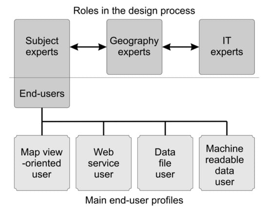 In a multidisciplinary approach, research groups share scientific goals and work on the same problem but look at it from their own discipline’s perspective. Thus, the UCD (user-centered design) is important when trying to design research infrastructures that are useful and easy to use. When multidisciplinary spatial data infrastructures are being planned and implemented, we identified three key roles in the user-centered design process: subject matter expertise, geography expertise, and IT expertise. Scientists from the related subject fields are both data producers and data users and therefore carry the knowledge about the properties and content of the data, and the needs of the scientific community. Geographers and geoinformation scientists have a key role in designing a spatial data platform, where the location and time of the diverse data are used as their unifying factors. This also demands a firm understanding of the main concepts and terminology from the related fields—i.e., technical GIS skills might not be sufficient for designing user-friendly infrastructures. Collaboration with IT experts is crucial when the various functionalities of the service are being implemented.
